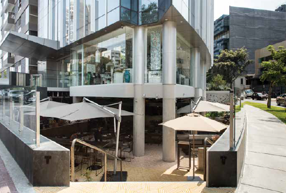 El proyecto resuelve el acceso vehicular al estacionamiento sin interferir con el desarrollo de locales comerciales a nivel de calle ni con el ingreso peatonal a la torre de oficinas. Para ello, se separan los accesos en los extremos del predio y se concentran dos niveles de comercio en la esquina de mayor visibilidad y valor. El semisótano alberga el restaurante “500 grados”, reforzando el carácter gastronómico del entorno, mientras que sobre este se ubican dos locales comerciales con acceso directo desde la calle.