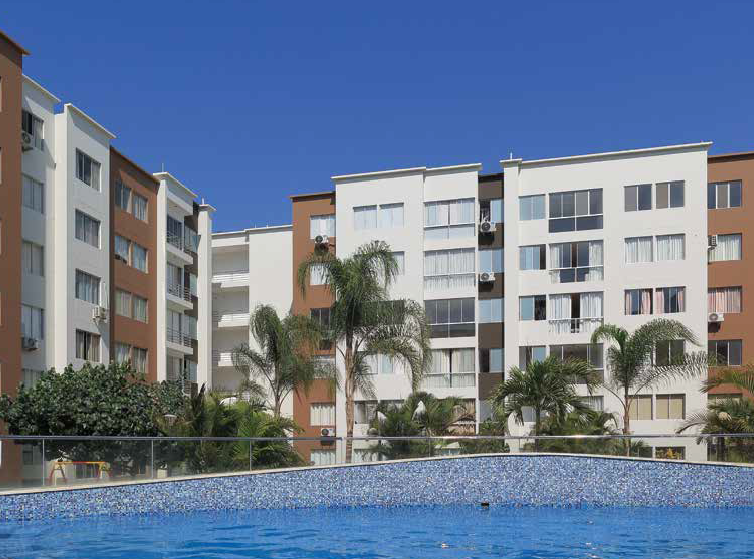 El proyecto se organiza a partir de dos patios internos que concentran áreas recreativas, piscinas y jardines, rodeados por edificios de seis pisos con ascensores ubicados en cada vértice. De los 390 departamentos, el 90% corresponde a unidades de tres dormitorios, mientras que el resto se distribuye entre uno y dos dormitorios.