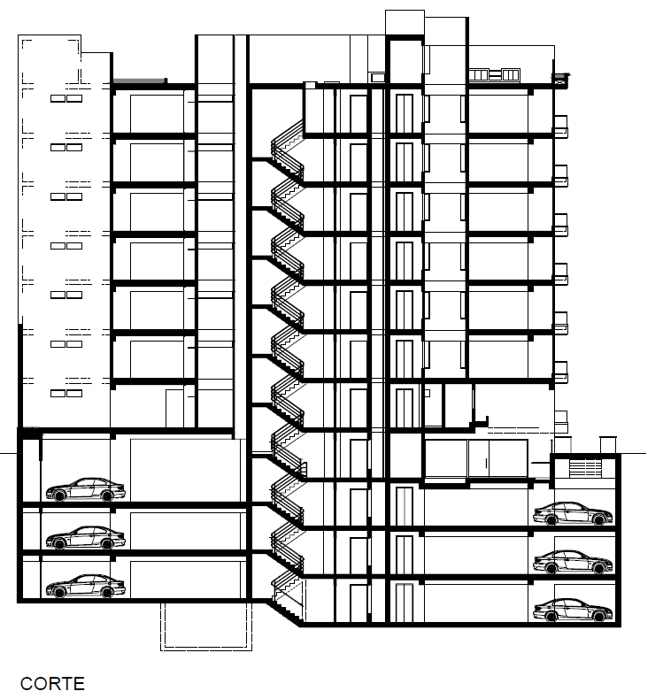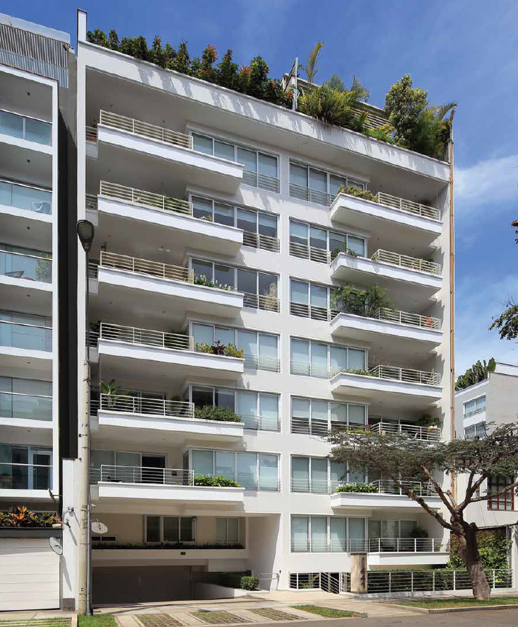 Detrás de una elegante fachada de siete pisos con generosos balcones se desarrollan doce amplios departamentos de tres dormitorios en 190 o 175 m2, con salas comedores en todo el frente. Las cocinas cuentan con islas que incorporan mesas para seis comensales e incluyen áreas de servicio completas. Un estar intermedio entre el área social y los dormitorios permite dotar de privacidad a estos últimos. El proyecto, desarrollado en un terreno de 595 m2, incluye dos departamentos de dos dormitorios en primer piso, con patios y terrazas interiores. En el último piso se desarrollan dos penthouses con piscina en sus aires. Los 4871 m2 construidos incluyen 45 estacionamientos vehiculares en tres sótanos y medio.